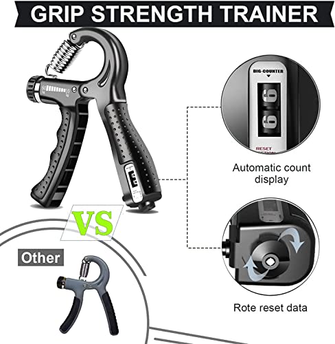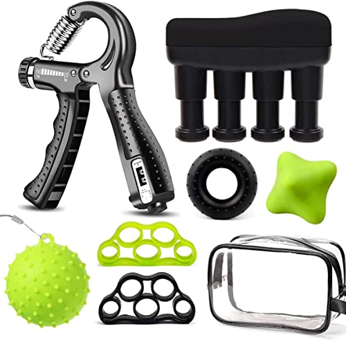 Hand Trainer Vinger Trainer Kit-7 Pack: De Grip Strengthener Trainer bestaat uit een verstelbare handgrijper met teller, vingersterkte trainer, handversterkende handgreep ring (50Lbs), zeshoekige massage bal, hand stress bal, 2 stuks vinger rekker (6,6Lbs, 8,8Lbs op elke vinger) en opberghoes.