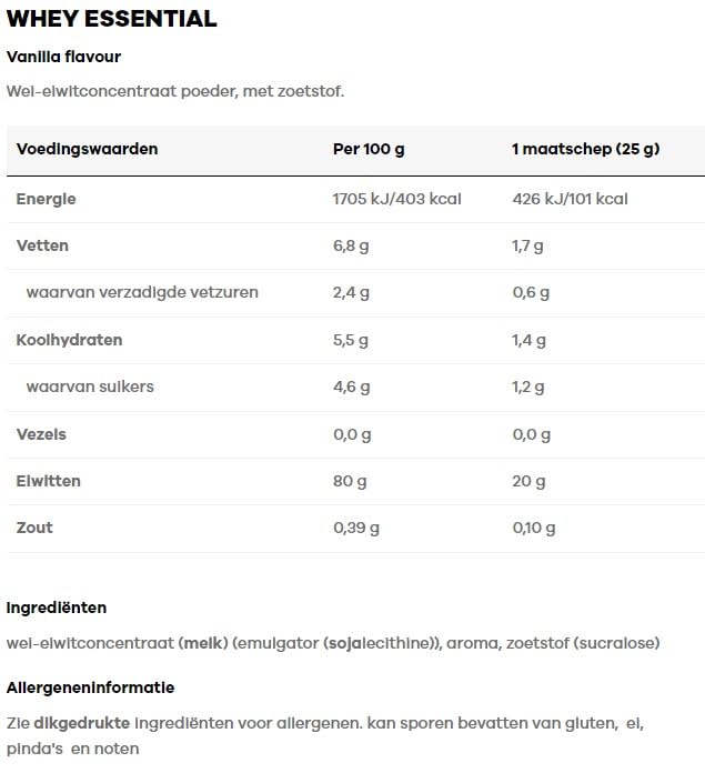HOOG IN EIWIT: Elke portie van Whey Essential bevat 24 g eiwit, wat bijdraagt aan de groei en het behoud van spiermassa.